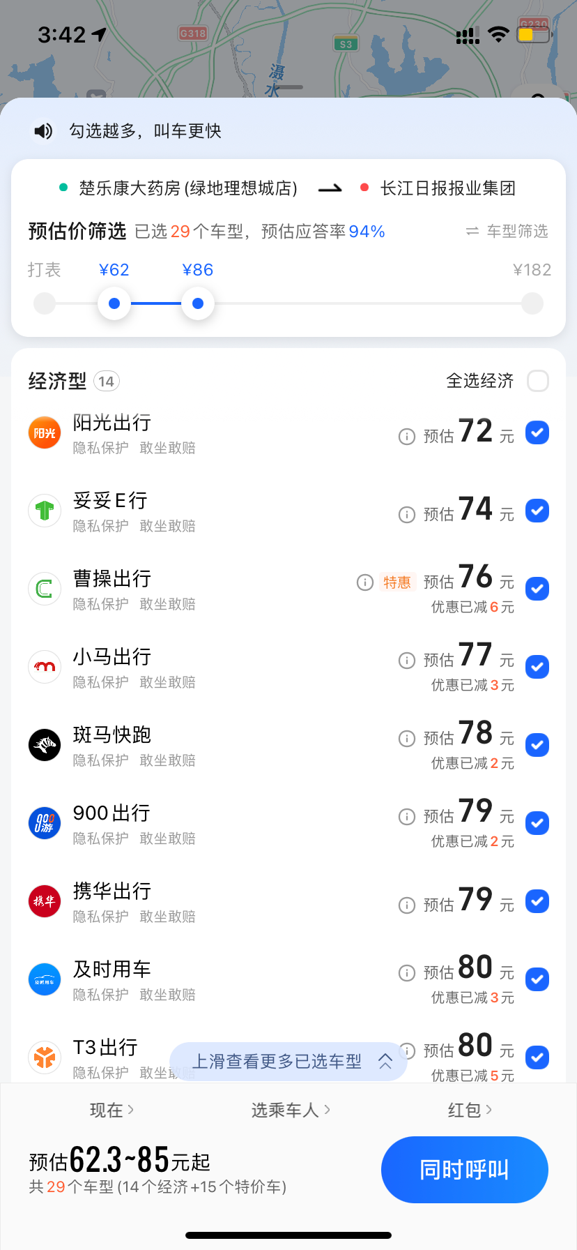 在这29个车型中预估的车价从62.3元到85元不等,差价达到20元以上。其中特价车型分别为风韵出行、方舟行、呼我出行、及时用车、三合e行等知名度较低的品牌。